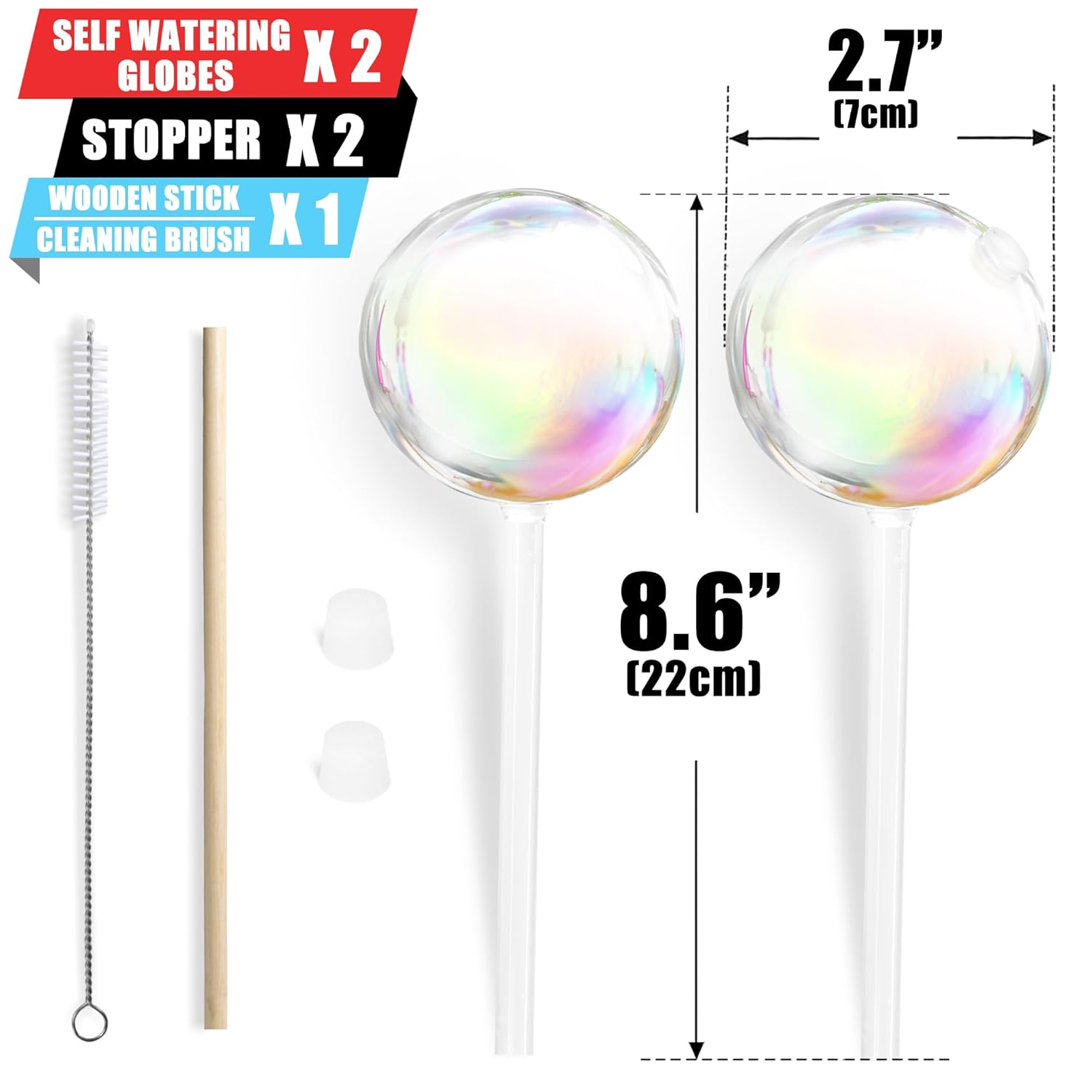 - ALL-IN-ONE VALUE SET – Includes 2 glass watering globes (Ø7cm, 22cm long), 2 leak-resistant silicone stoppers, 1 wooden stick for easy soil insertion, and 1 cleaning brush to maintain long-term performance. Everything you need in one box.