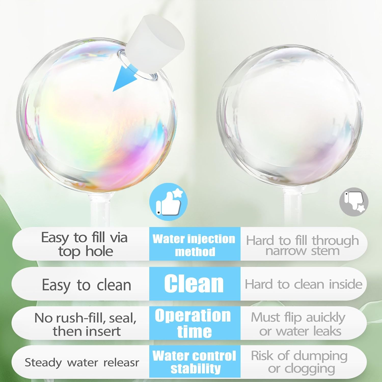 - EASY-FILL STOPPER DESIGN – Unlike fully sealed models, these globes feature a built-in refill hole and stopper for quick, mess-free filling and better water flow control. No need to rush during setup—just fill, plug, and insert.